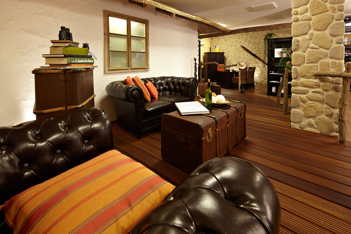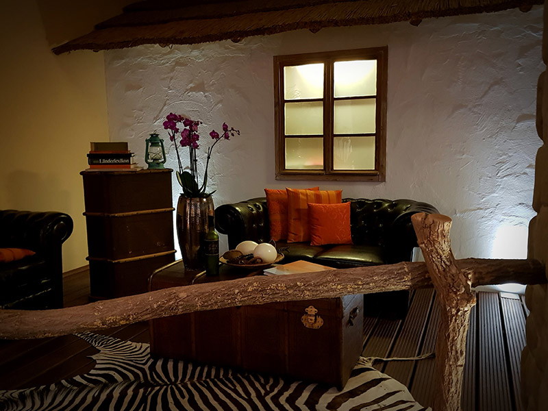 Und mittendrin: Eine „afrikanische Lodge“, auf deren Holz-Veranda  unsere Kunden Platz nehmen, einen Kaffee genießen und sich für die schönsten Wochen des Jahres beraten lassen können.